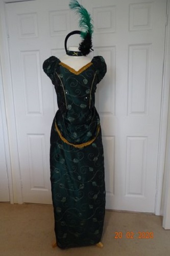 Costume comprises of a dark green emerald taffeta dress with a gold thread feather patterned detailing , matching choker ,feather headdress , petticoat and bustle bum pad